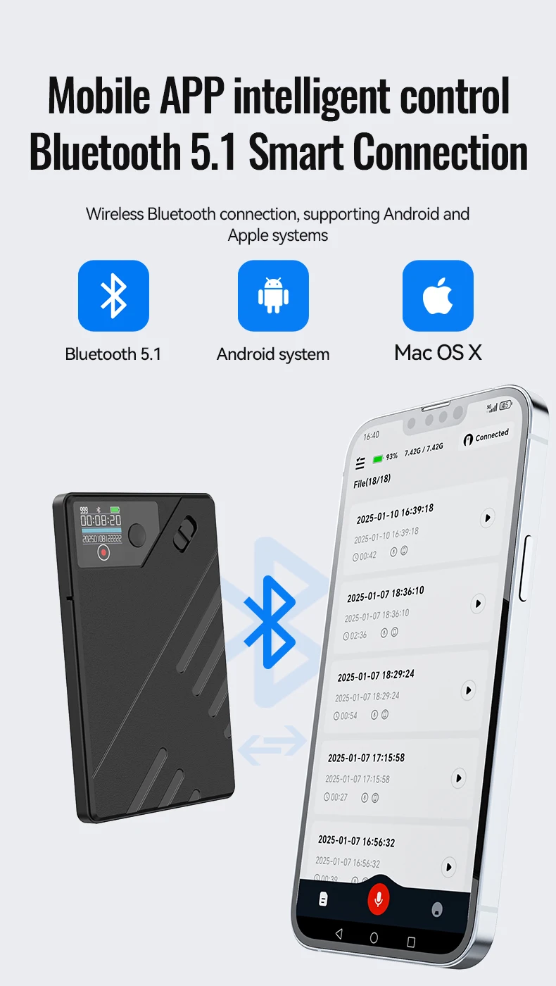 **Mobile App Control**: Connect wirelessly via Bluetooth 5.1 to your Android or Apple device. Control the recorder, manage files, and access recordings conveniently through the mobile app.