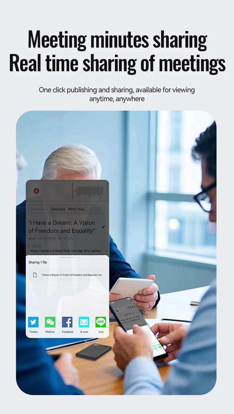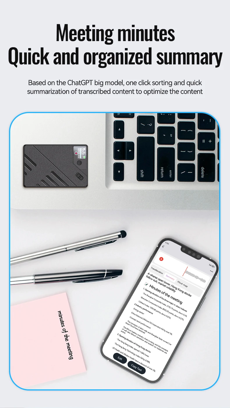 **Efficient Meeting Minutes**: Based on the ChatGPT big model, it offers one - click sorting and quick summarization of transcribed content. Optimize your meeting records and save valuable time. Plus, with one - click publishing and sharing, you can share meeting minutes anytime, anywhere.